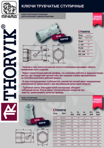 BS6P95 Ключ трубчатый ступичный шестигранный, 95 мм Thorvik