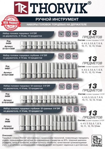 S11S2213SM Набор головок торцевых глубоких 12-гранных 1/4"DR на держателе, 4-14 мм, 13 предметов Thorvik