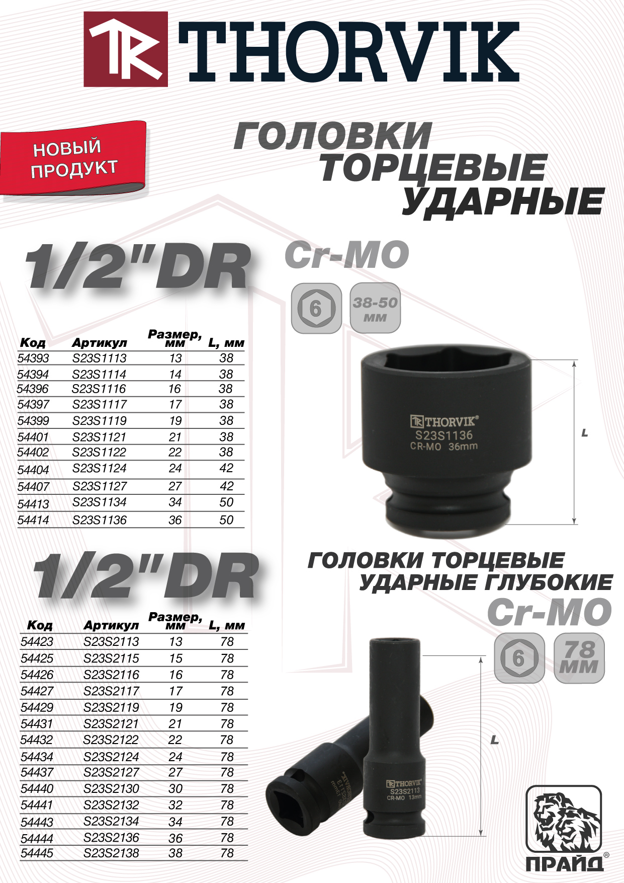S23S2136 Головка торцевая ударная глубокая 1/2"DR, 36 мм Thorvik