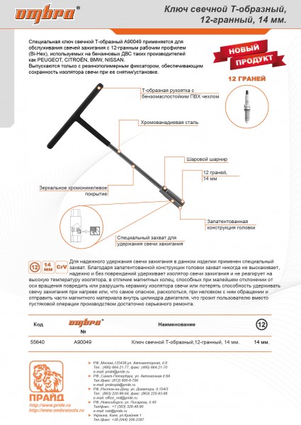 A90049 Ключ свечной Т-образный 12-гранный, 14 мм Ombra