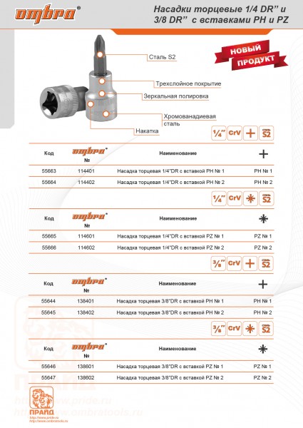 Ombra 114402 Насадка торцевая 1/4"DR с вставкой-битой крестовой, РН2 114402