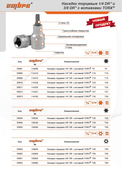 114308 Насадка торцевая 1/4"DR с вставкой-битой TORX®, T8 Ombra