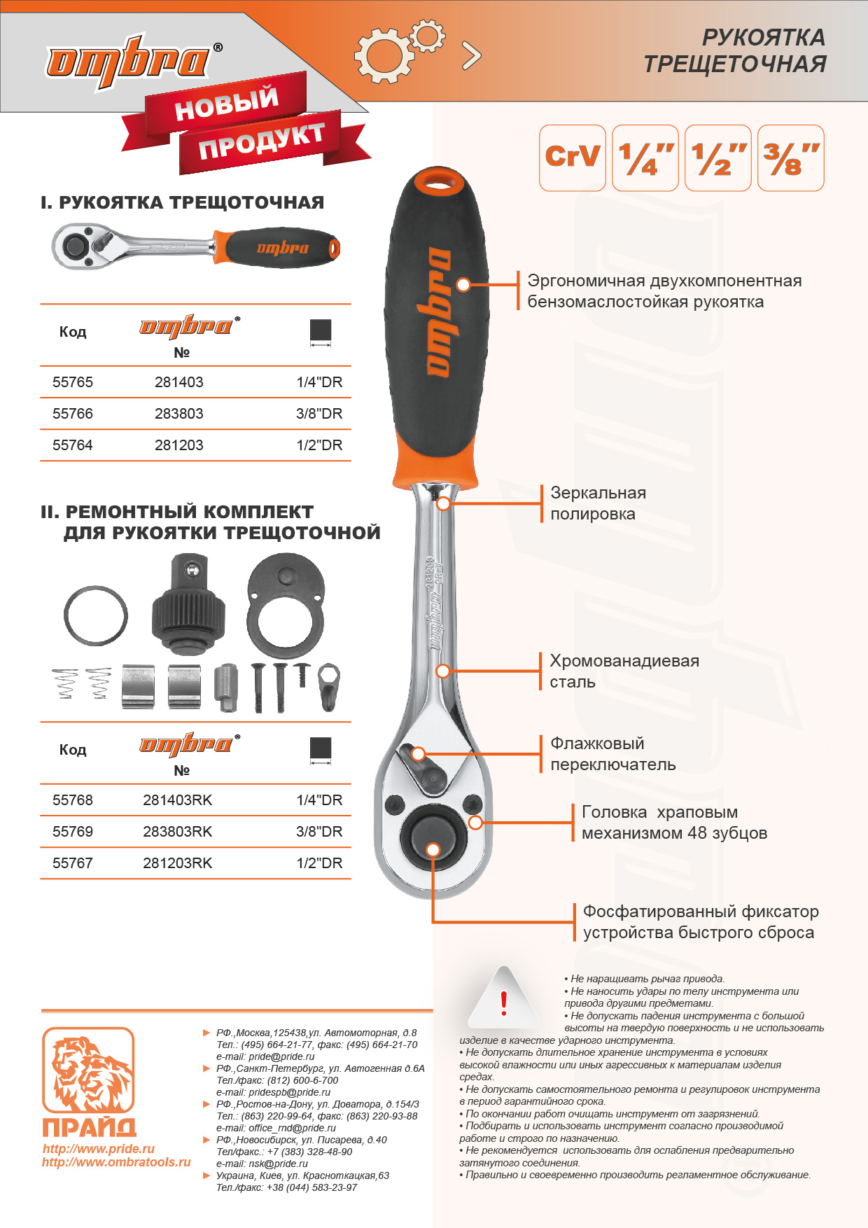 Трещоточная рукоятка с флажковым переключателем и композитной, оригинальной двухкомпонентной бензомаслостойкой рукояткой, обеспечивающей надежный захват инструмента при работе. Изделие соответствует требованиям ГОСТ 22402-77. Зеркальное хромоникелевое покрытие. Храповое колесо в 48 зубца, обеспечивающее 7,5° свободного хода и увеличенное пятно контакта храпового механизма, гарантирует большой запас прочности при высоком крутящем моменте. Устройство быстрого сброса обеспечивает легкую смену и надежно фиксирует насадку на приводе.