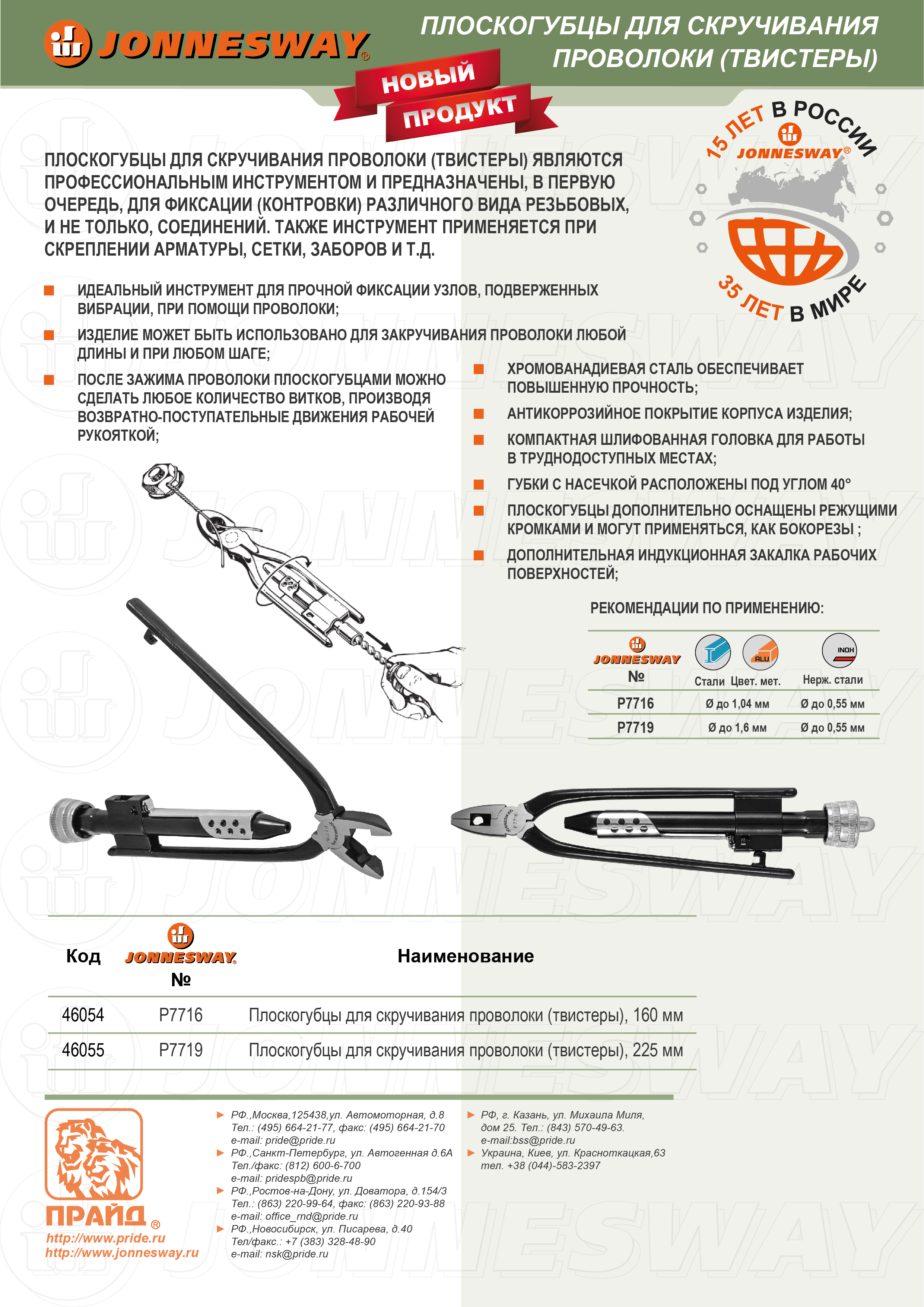 Плоскогубцы для скручивания проволоки. После зажима проволоки плоскогубцами можно сделать любое количество витков, производя возвратно-поступательные движения рабочей рукояткой.Хромованадиевая сталь обеспечивает повышенную прочность. Антикоррозийное покрытие корпуса изделия. Компактная шлифованная головка для работы в труднодоступных местах. Губки с насечкой расположены под углом 40°. Плоскогубцы дополнительно оснащены режущими кромками и могут применяться, как бокорезы. Дополнительная индукционная закалка рабочих поверхностей.