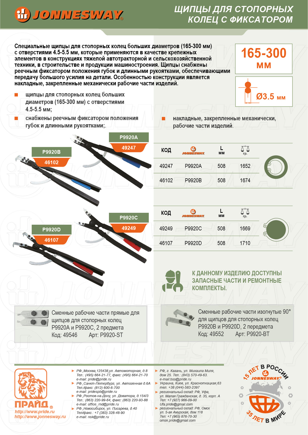 P9920B Щипцы загнутые 90° с фиксатором для стопорных колец, сжим, 165-300 мм, 4.5-5.5 мм, 500 мм Jonnesway