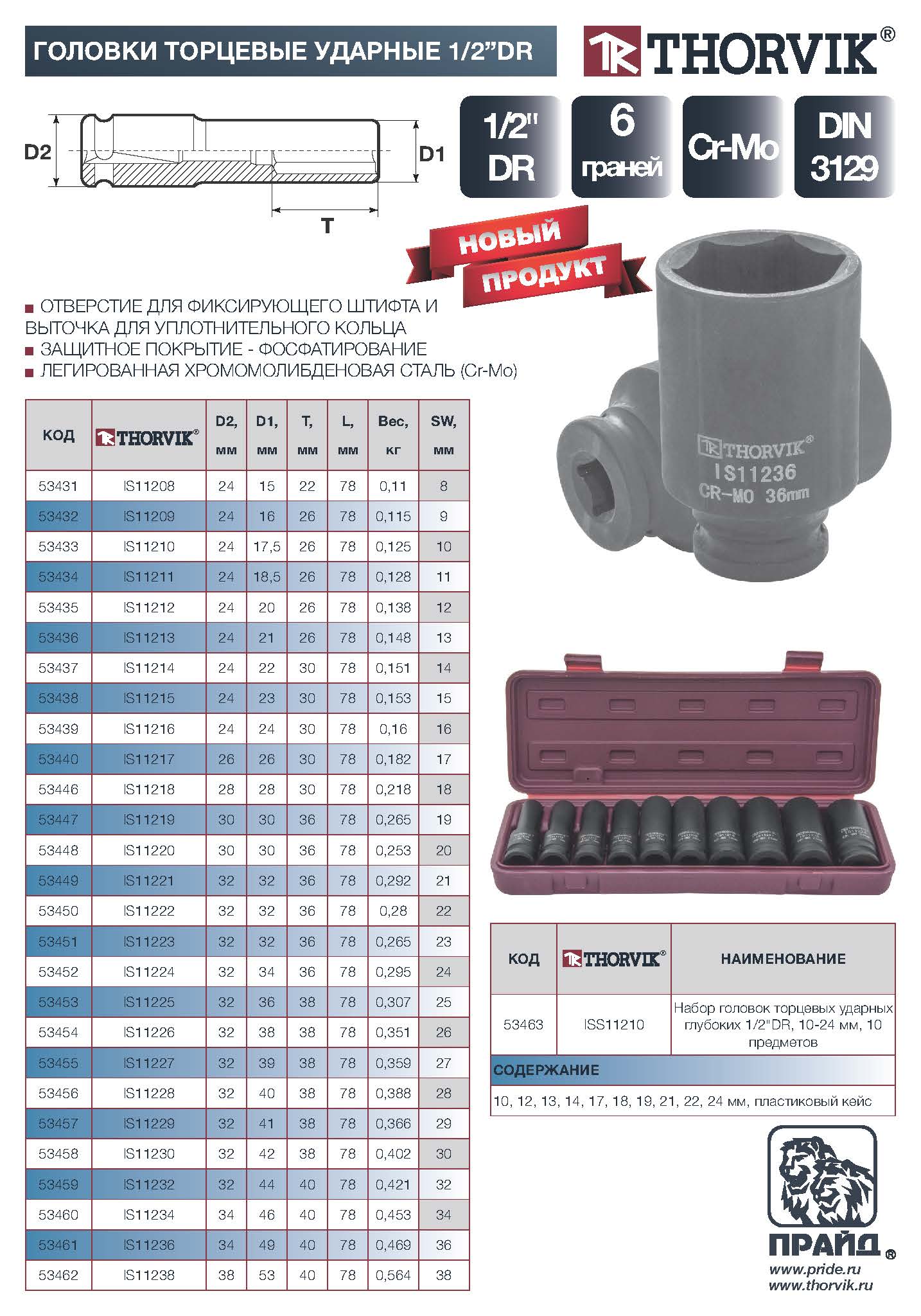 Головка торцевая ударная глубокая 1/2"DR, 30 мм. Торцевые головки Thorvik изготовлены с применением технологий, позволяющих передавать усилия, превышающие расчетные по современным стандартам на 30%. Широкий диапазон размеров, типов и профилей, высокая точность обработки, качественная хромомолибденовая сталь (Cr-Mo) и устойчивое фосфатированное покрытие делают инструмент надежным и долговечным. Торцевые головки Thorvik являются основной для создания систем сборного слесарно-монтажного инструмента. Имеет отверстие для фиксирующего штифта и выточка для уплотнительного кольца.