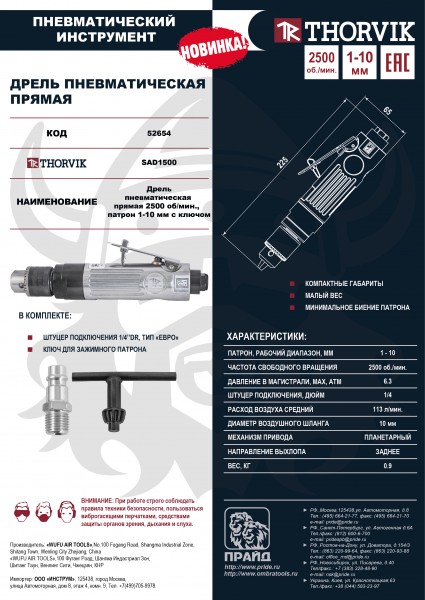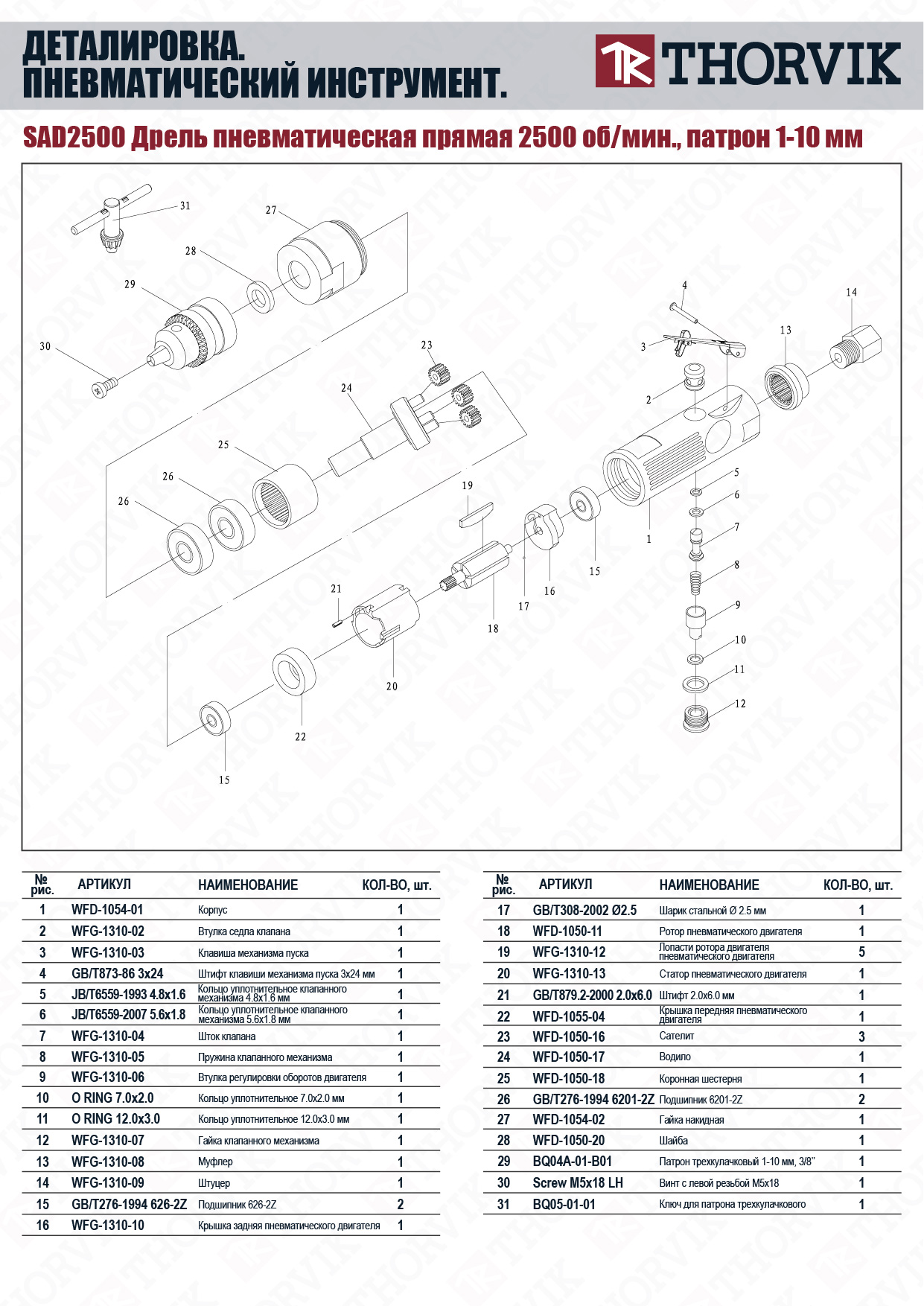 SAD2500 Дрель пневматическая прямая 2500 об/мин., патрон 1-10 мм Thorvik
