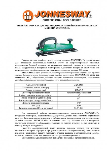 Пневматическая линейная шлифовальная машина Jonnesway предназначена для проведения шлифовально-зачистных работ на непрофилированых линейных поверхностях большой площади по материалам различной твердости, в мастерских и цехах, оборудованных воздушной магистралью с давлением воздуха не ниже 6 атм. или компрессором, такой же мощности и производительностью не ниже 300 л/мин.