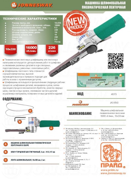 Jonnesway JAS-6543 Машинка шлифовальная пневматическая, ленточная, 16000 об./мин., 10х330 мм JAS-6543