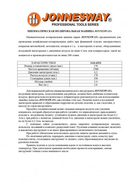 Пневматическая полировальная машина марки Jonnesway предназначена для проведения шлифовально-полировальных работ при финишной отделке лакокрасочного покрытия автомобилей, мотоциклов, катеров и т.д. . в мастерских и цехах, оборудованных воздушной магистралью с давлением воздуха не ниже 6 атм. или компрессором, такой же мощности и производительностью не ниже 200 л/мин.