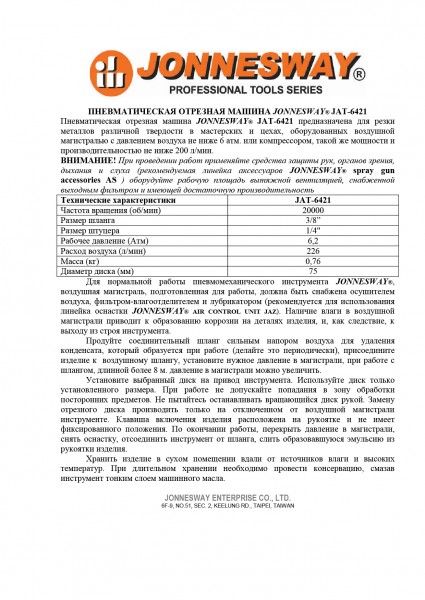 JAT-6421 Машинка пневматическая торцевая отрезная 20000 об./мин., 170 л/м Jonnesway