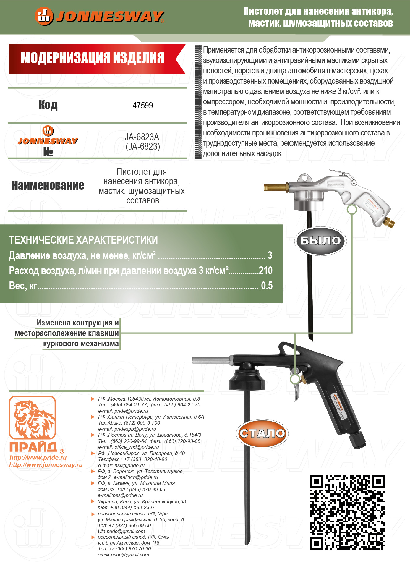 Пистолет для нанесения антикора, мастик, шумозащитных составов. Расход воздуха при рабочем давлении 3 кг/см² составляет 224 л/мин., масса изделия 0,5 кг. В качестве емкости для наносимого состава используются стандартные баллоны производителя, не содержащие сжатого газа, предназначенные для работы с оборудованием типа JONNESWAY JA-6823, емкостью 1000 мл. При возникновении необходимости проникновения антикоррозионного состава в труднодоступные места, рекомендуется использование дополнительных насадок.