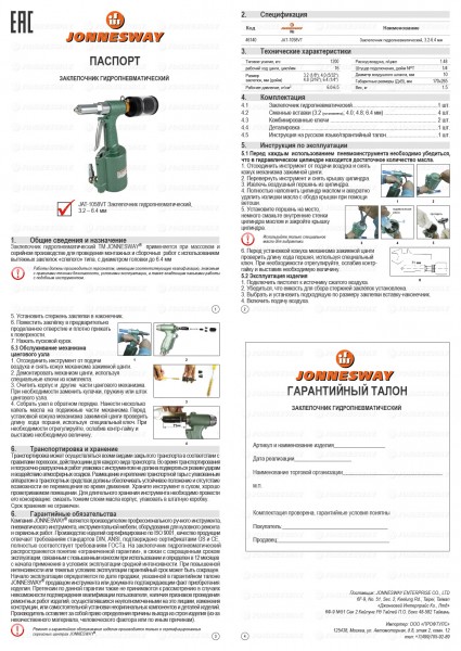 JAT-1058VT Заклепочник гидропневматический, 3.2 – 6.4 мм Jonnesway