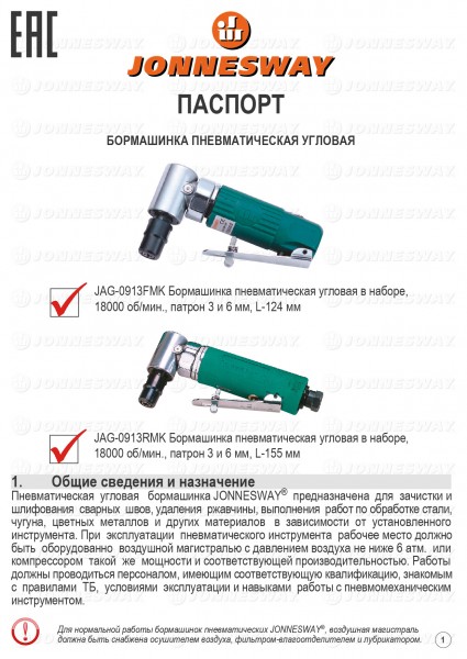 Пневматическая угловая бормашинка Jonnesway предназначена для зачистки и шлифования сварных швов, удаления ржавчины, выполнения работ по обработке стали, чугуна, цветных металлов и других материалов в зависимости от установленного инструмента. При эксплуатации пневматического инструмента рабочее место должно быть оборудованно воздушной магистралью с давлением воздуха не ниже 6 атм. или компрессором такой же мощности и соответствующей производительностью. Работы должны проводиться персоналом, имеющим соответствующую квалификацию, знакомым с правилами ТБ, условиями эксплуатации и навыками работы с пневмомеханическим инструментом