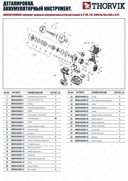 Thorvik BBIW342400DNB Гайковерт ударный аккумуляторный бесщёточный 3/4"DR, 21В, 2400 Нм, (без АКБ и З/У) BBIW342400DNB