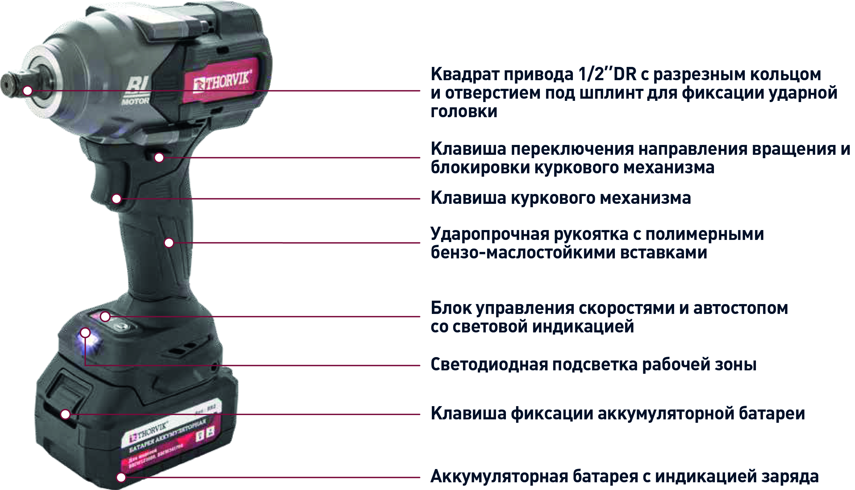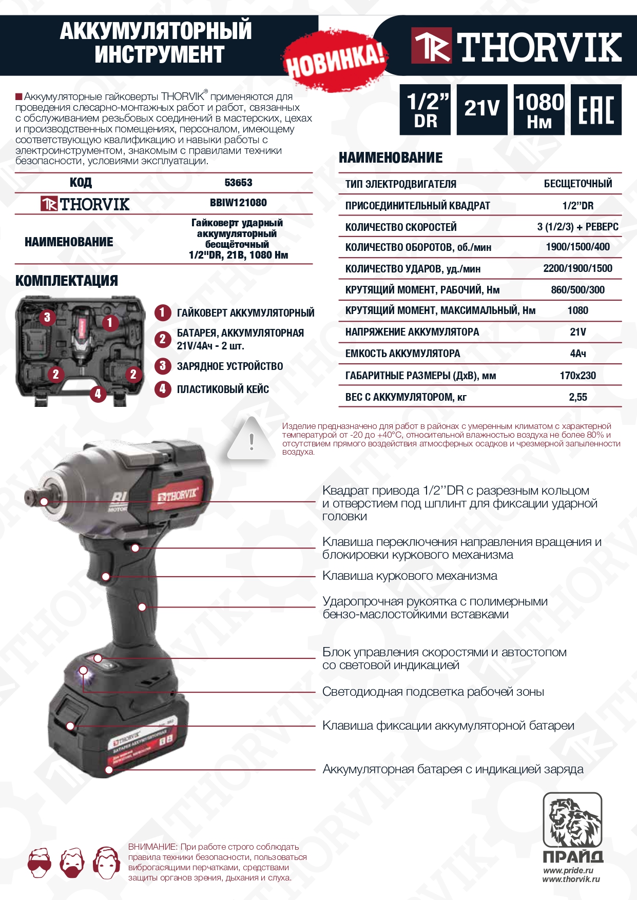 BBIW121080 Гайковерт ударный аккумуляторный бесщёточный 1/2"DR, 21В, 1080 Нм Thorvik