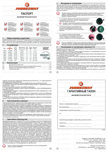 Динамометрические ключи JONNESWAY серии "Т21" предназначены для проведения слесарно-монтажных работ с крепежом любого присоединительного профиля с различным крутящим моментом. Диапазон регулировок момента для динамометрического ключа серии Т21200N составляет от 40 до 200 Нм. Динамометрические ключи JONNESWAY серии "Т21" внесены в ГРСИ (Государственный реестр средств измерений), относительная погрешность прибора составляет ±3%.