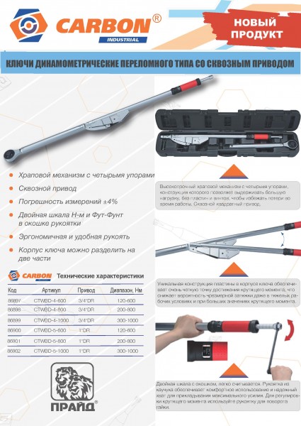 Ключ динамометрический переломного типа со сквозным приводом, 3/4"DR, 120-600 Нм CARBON, оснащен высокопрочным храповым механизмом с четырьмя упорами, конструкция которого позволяет выдерживать большую нагрузку. Уникальная конструкция пластины в корпусе ключа обеспечивает очень четкую точку достижения крутящего момента, что снижает вероятность чрезмерной затяжки даже в тяжелых рабочих условиях и при больших значениях крутящего момента. Двойная шкала с окошком, легко считывается. Рукоятка из каучука обеспечивает комфортное использование и надежный хват для прикладывания максимального усилия. Для регулировки крутящего момента используйте рукоятку для поворота гайки.