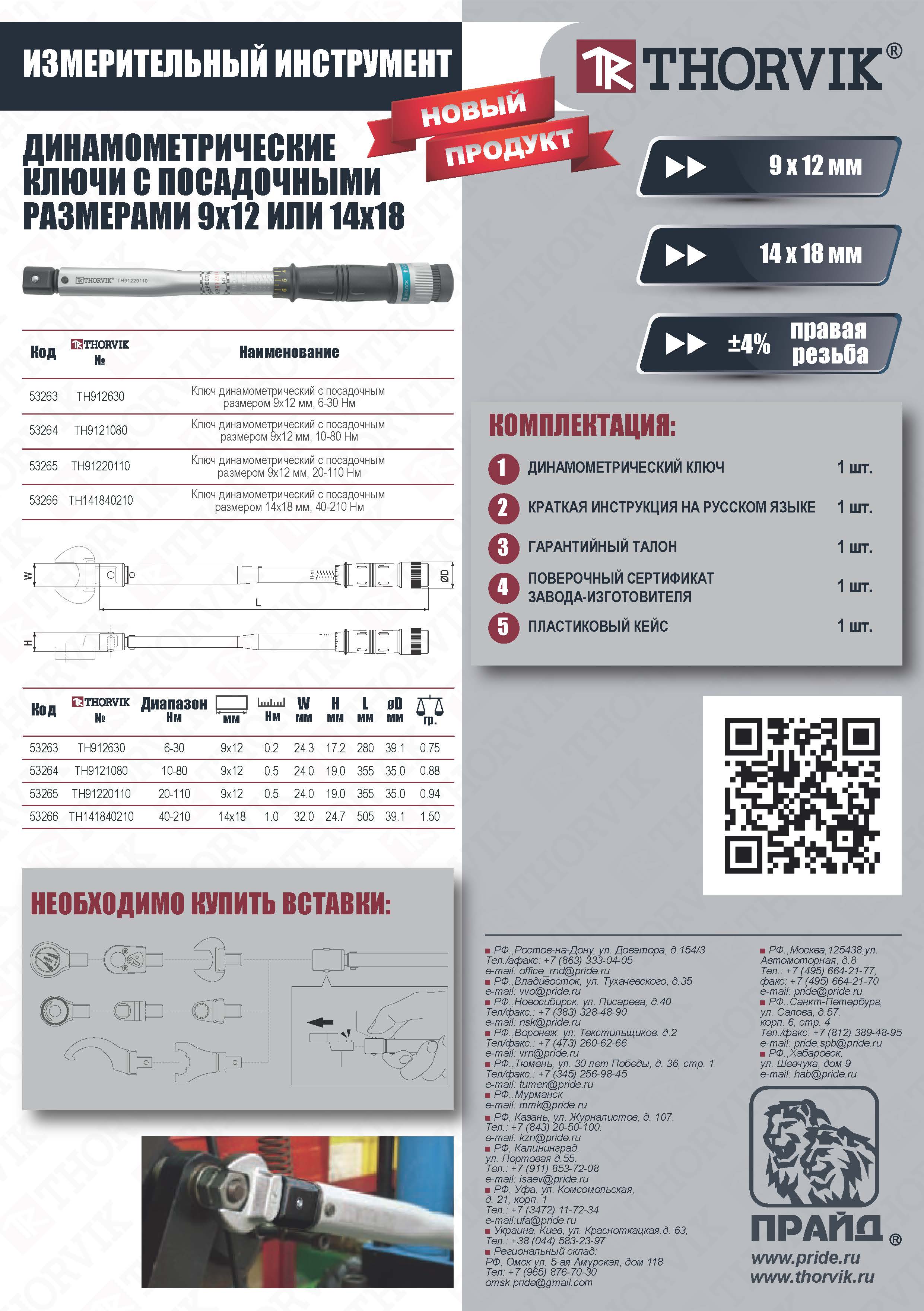 Динамометрические ключи THORVIK предназначены для проведения слесарно-монтажных работ с крепежом любого присоединительного профиля с различным крутящим моментом.  Применяются при обслуживании резьбовых крепежных элементов с правым вращением.