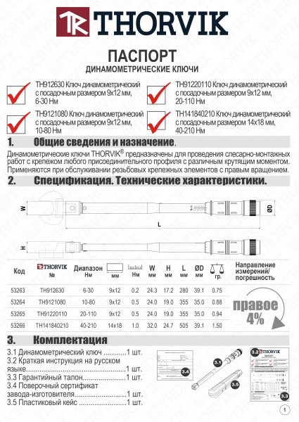 Динамометрические ключи THORVIK предназначены для проведения слесарно-монтажных работ с крепежом любого присоединительного профиля с различным крутящим моментом.  Применяются при обслуживании резьбовых крепежных элементов с правым вращением.