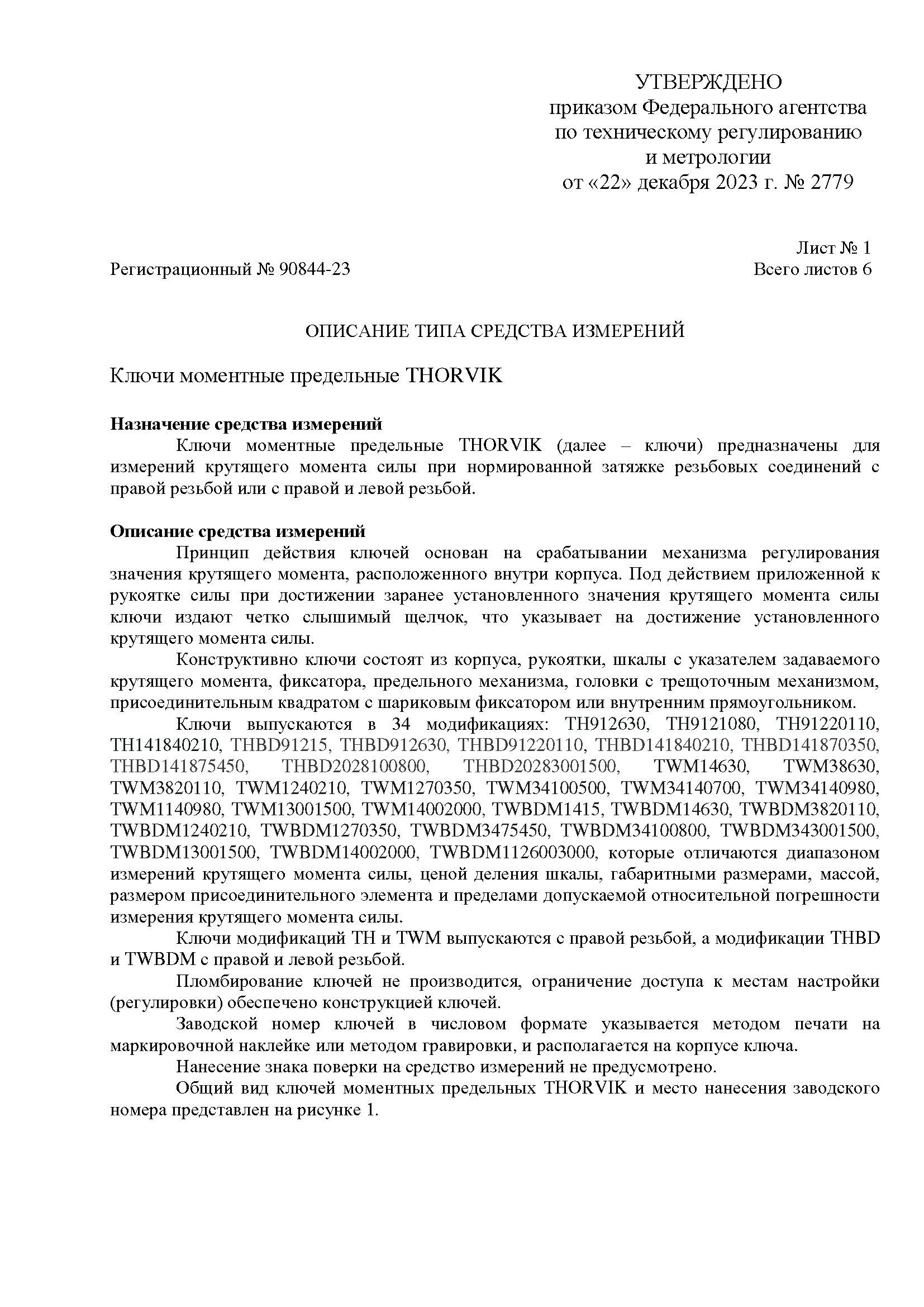 Динамометрические ключи  THORVIK внесены в ГРСИ (Государственный реестр средств измерений), присвоен регистрационный номер 90844-23 в Государственном реестре средств измерений по приказу Росстандарта №2779 от 22.12.2023 г.