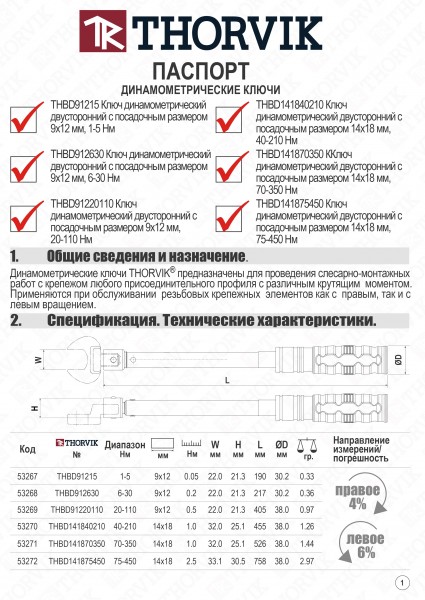 Динамометрические ключи THORVIK предназначены для проведения слесарно-монтажных работ с крепежом любого присоединительного профиля с различным крутящим моментом. Применяются при обслуживании резьбовых крепежных элементов как с правым, так и с левым вращением.