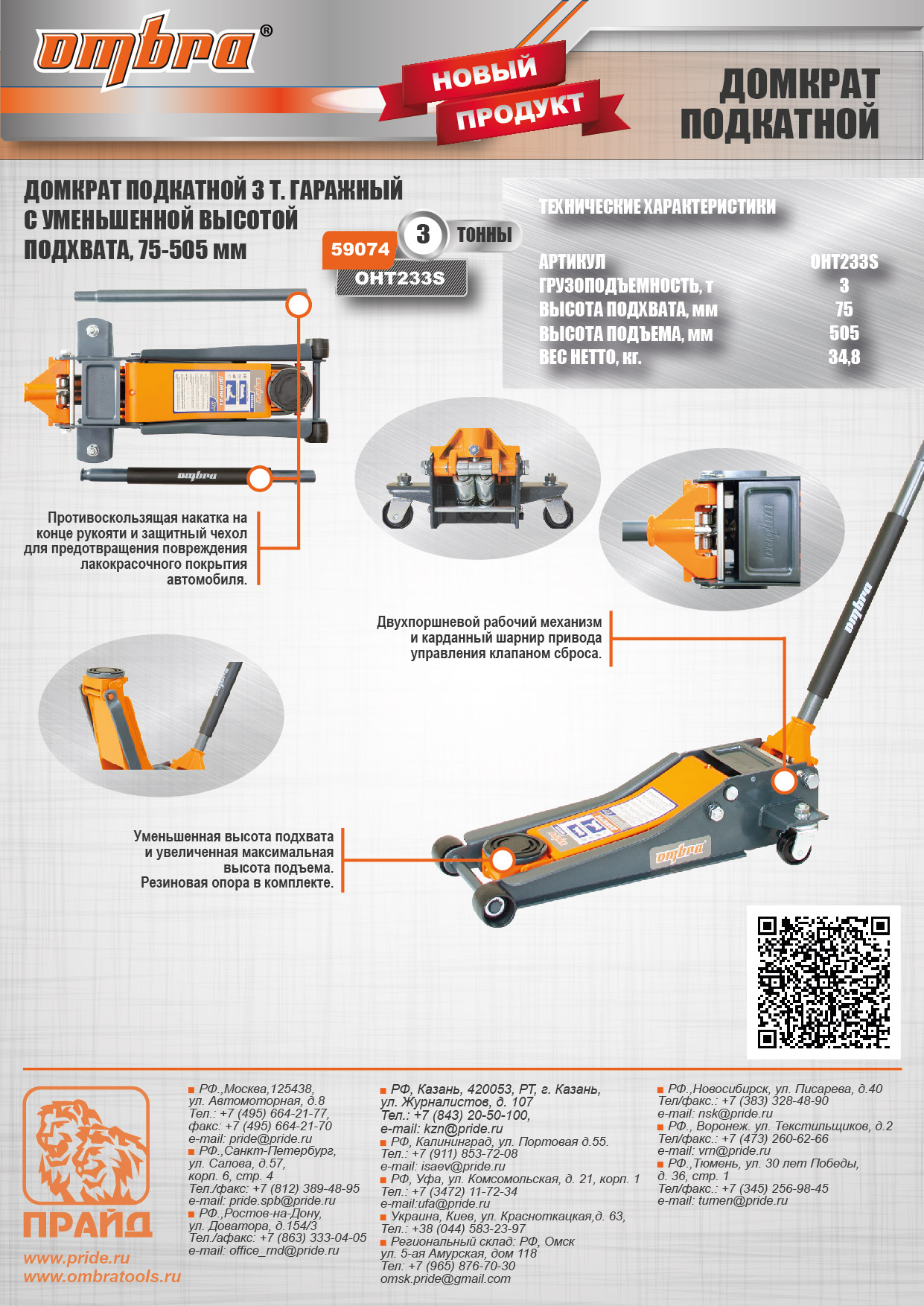 Ombra OHT233S Домкрат подкатной 3 т. гаражный двухпоршневой, с уменьшенной высотой подхвата, 75-505 мм OHT233S