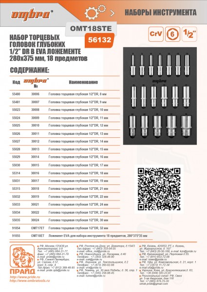 Ombra OMT18STE Набор головок торцевых глубоких 1/2" DR 8-32 мм в EVA ложементе 280х375 мм, 18 предметов OMT18STE