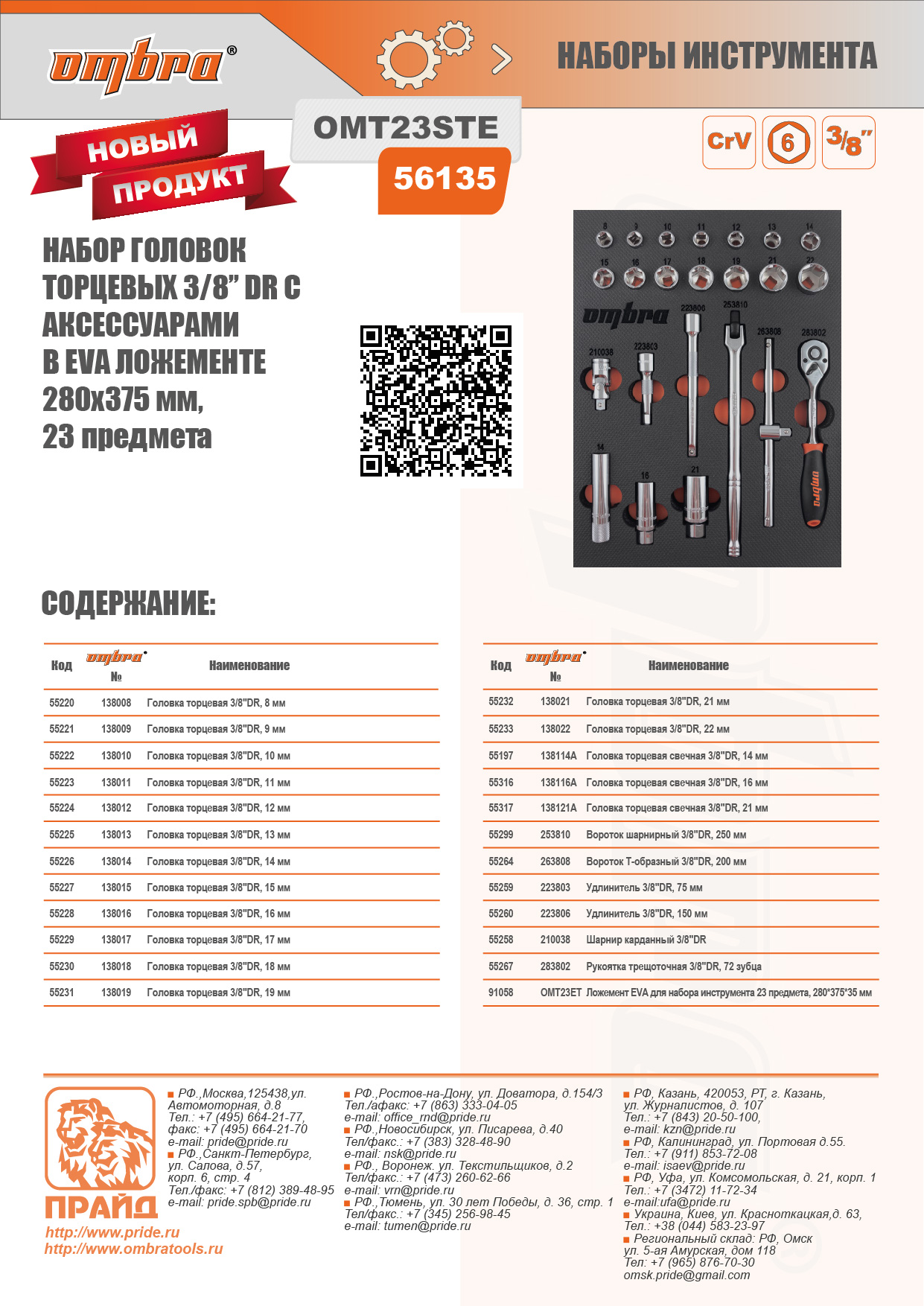 Ombra OMT23STE Набор головок торцевых 3/8" DR 8-22 мм с аксессуарами в EVA ложементе 280х375 мм, 23 предмета OMT23STE