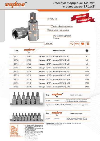 912779 Набор насадок торцевых 1/2"DR с вставками-битами SPLINE на держателе, M5-M18, 9 предметов Ombra