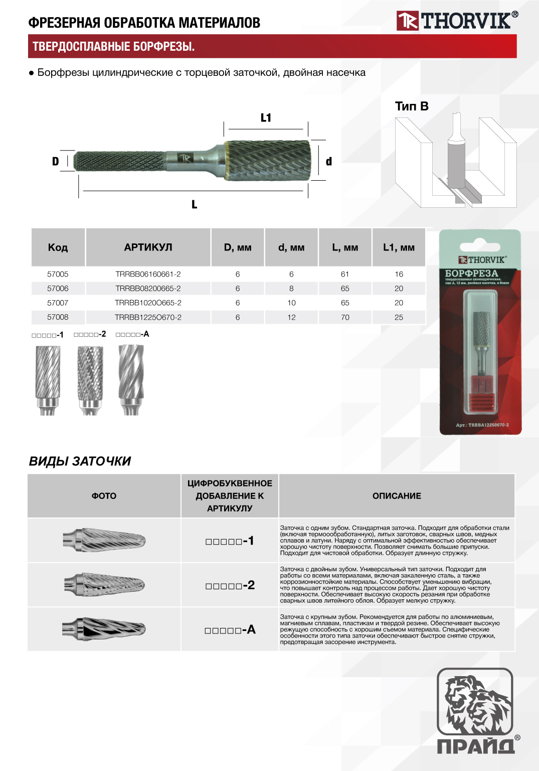 TRRBB08200665-2 Борфреза твердосплавная цилиндрическая с торцевой заточкой, тип B, 8 мм, двойная насечка, в боксе Thorvik