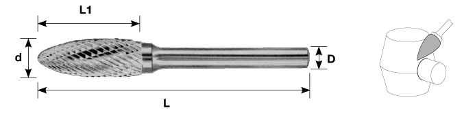 Борфреза твердосплавная пламевидная, тип H, 10 мм, двойная насечка, хвостовик 6 мм, в боксе Carbon