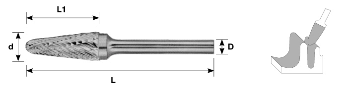 Борфреза цельнотвердосплавная коническая с радиусным торцом, тип L, 3 мм, двойная насечка, хвостовик 3 мм, в боксе Carbon