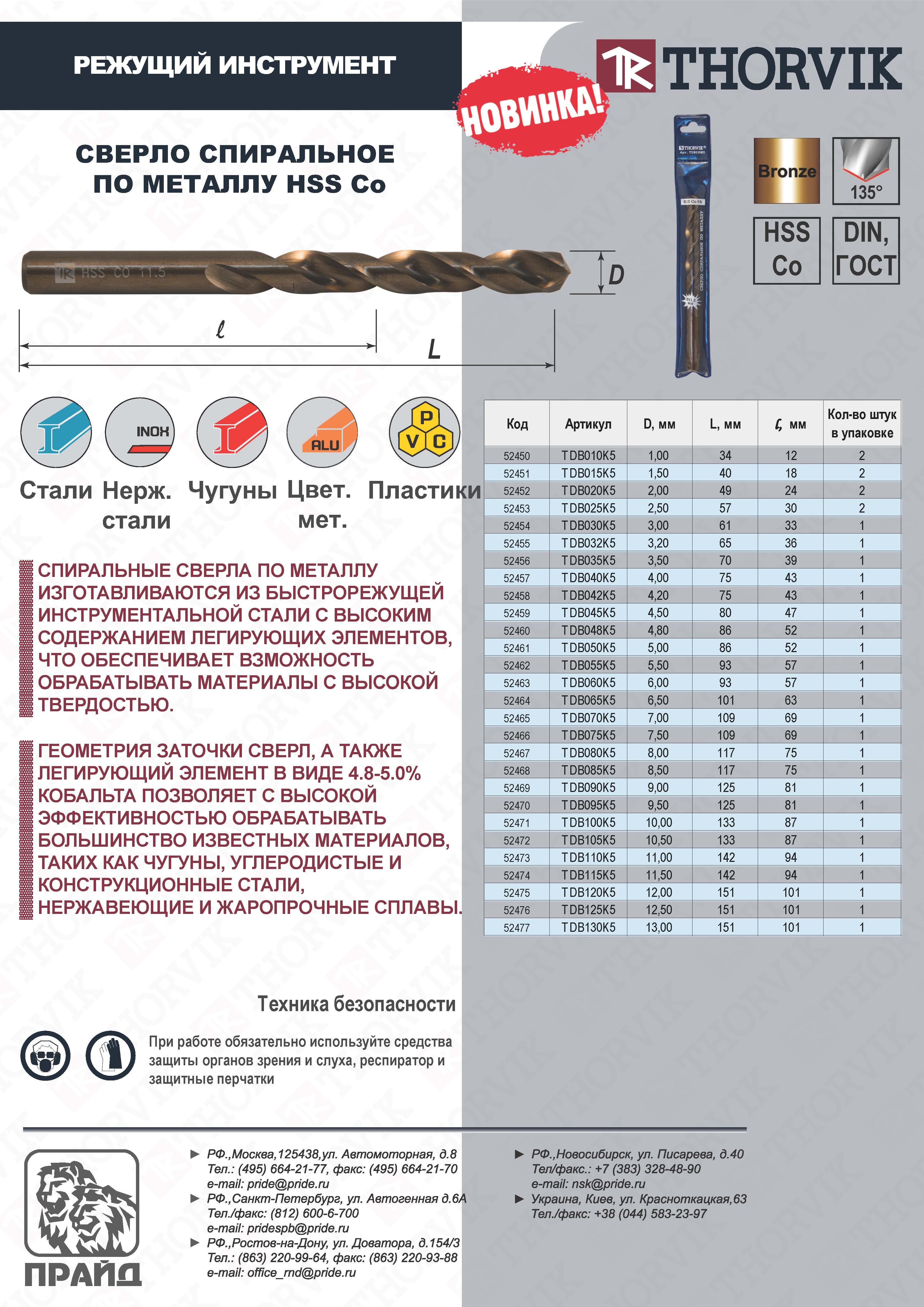 Сверло спиральное по металлу HSS Co в ПВХ упаковке, d9.0 мм. Спиральные сверла по металлу Thorvik изготавливаются из быстрорежущей инструментальной стали с высоким содержанием легирующих элементов в виде кобальта 4,8 - 5%, что обеспечивает возможность обрабатывать материалы с высокой твердостью. Геометрия заточки сверл позволяет с высокой эффективностью обрабатывать большинство известных материалов, таких как чугуны, углеродистые и конструкционные стали, нержавеющие и жаропрочные сплавы. Спиральные сверла Thorvik изготовлены по стандарту DIN 338 тип N и полностью соотвествуют техническим условиям ГОСТ 10902-77.