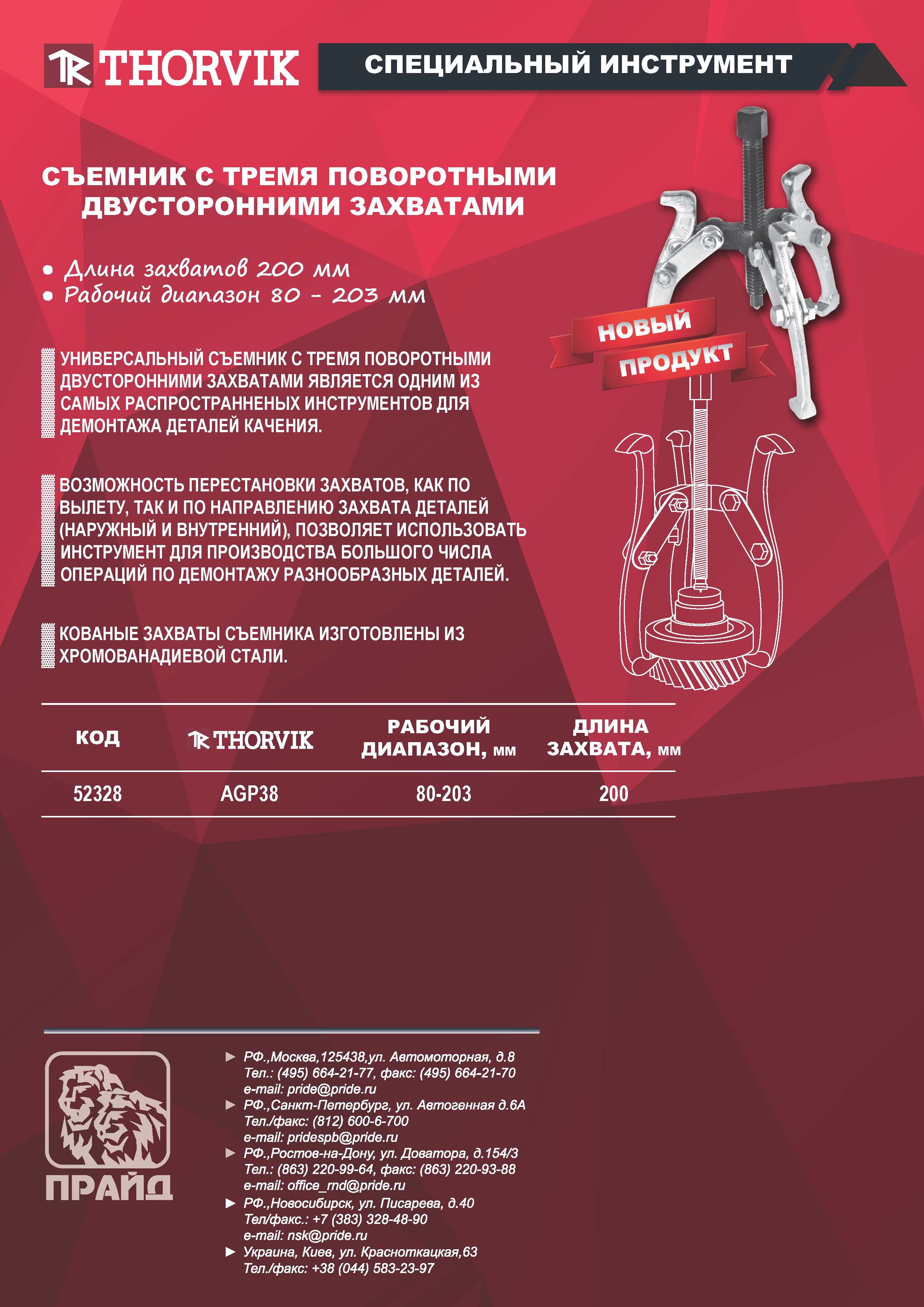 AGP38 Съемник с тремя поворотными двусторонними захватами 200 мм, диапазон захватов 80-203 мм Thorvik