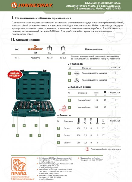 Съемник универсальный, американского типа со скользящими 2-3 захватами в наборе, диапазон захватов внутр./наружн. 60-160/40-120, глубина 100-250 мм. Для удобства детали набора хранятся в оригинальном пластиковом кейсе.