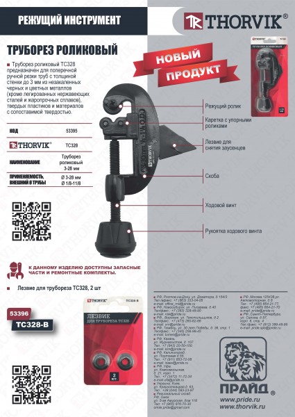 Труборез роликовый TC328 предназначен для поперечной ручной резки труб с толщиной стенки до 3 мм из незакаленных черных и цветных металлов, (кроме легированных нержавеющих сталей и жаропрочных сплавов), твердых пластиков и материалов с сопоставимой твердостью.