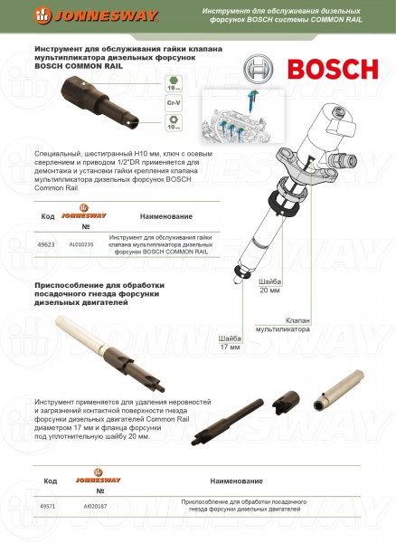 Инструмент применяется для удаления неровностей и загрязнений контактной поверхности гнезда форсунки дизельных двигателей Common Rail диаметром 17 мм и фланца форсунки под уплотнительную шайбу 20 мм.