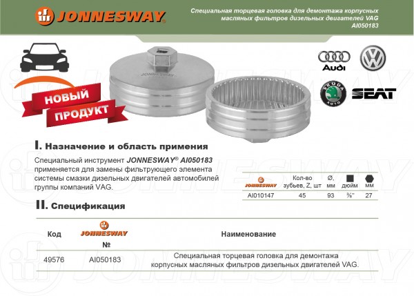 AI050183 Специальная торцевая головка для демонтажа корпусных масляных фильтров дизельных двигателей VAG Jonnesway
