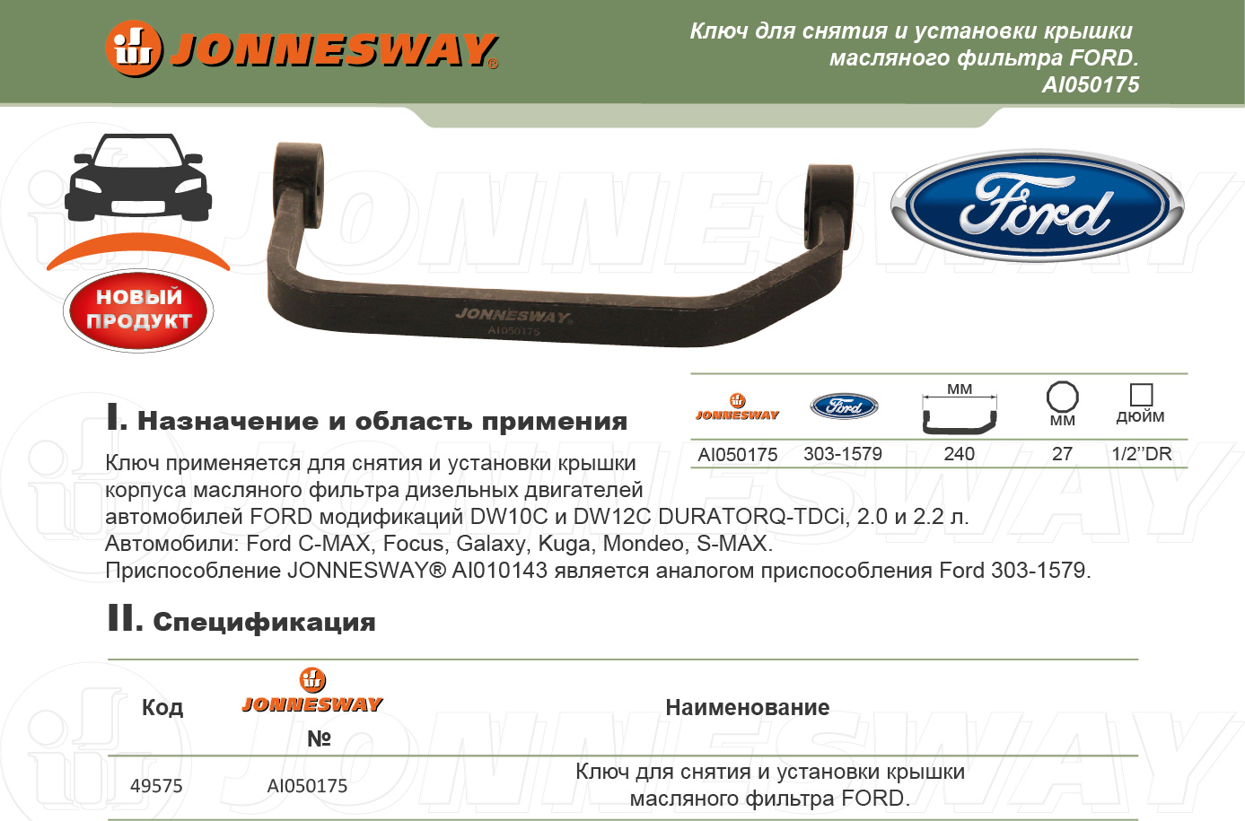 Приспособление JONNESWAY® AI010143 является аналогом приспособления Ford 303-1579.
