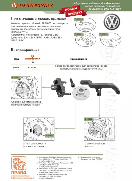 AL010201 Набор приспособлений для обслуживания насоса системы охлаждения двигателей VAG Jonnesway