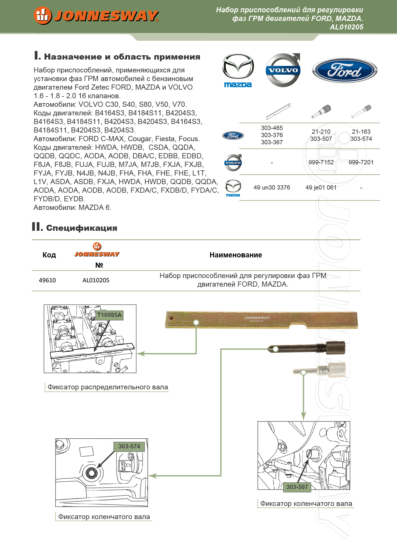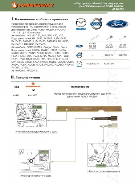 AL010205 Приспособление для регулировки фаз ГРМ двигателей FORD, MAZDA. Jonnesway