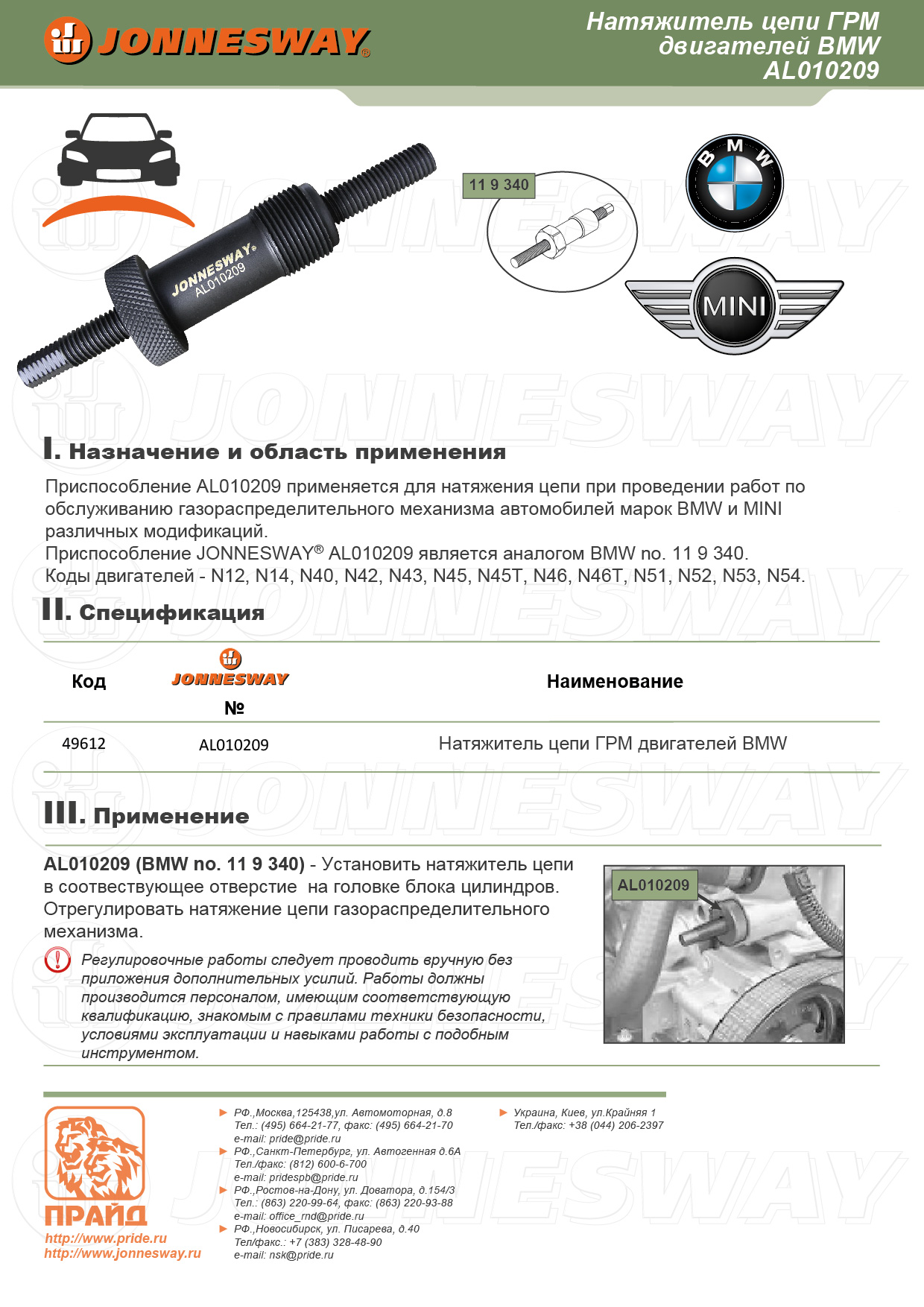 AL010209 Натяжитель цепи ГРМ двигателей BMW. BMW 119 340 Jonnesway