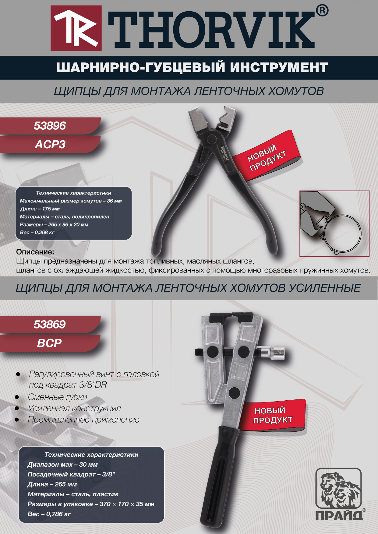 Щипцы для монтажа ленточных хомутов усиленные Thorvik, применяются для установки новых “замковых” хомутов пыльников ШРУСов, изготовленных из нержавеющей стали, при монтаже которых рекомендовано дозированное воздействие на соединение. Правильно использовать изделие в сочетании с динамометрическим ключом с приводом 3/8"DR.