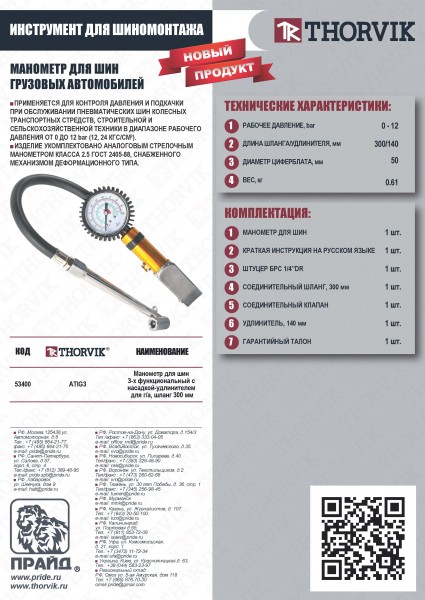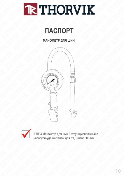 Thorvik ATIG3 Манометр для контроля давления и подкачки шин с насадкой-удлинителем для г/а, шланг 300 мм ATIG3