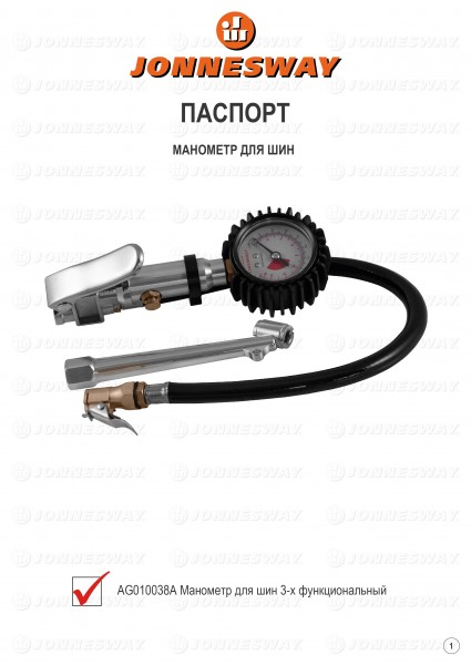 Jonnesway AG010038S Манометр для контроля давления и подкачки шин с насадкой-удлинителем для г/а, шланг 300 мм AG010038S