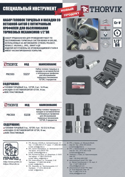 PBCSS5 Набор головок торцевых и насадки со вставкой-битой с пятигранным профилем для обслуживания тормозных механизмов 1/2"DR, 5 предметов Thorvik
