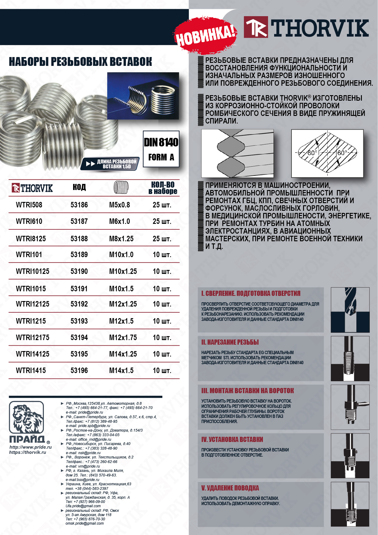 Резьбовые вставки предназначены для восстановления функциональности и изначальных размеров изношенного или поврежденного резьбового соединения. Резьбовые вставки Thorvik изготовлены из коррозионностойкой проволоки ромбического сечения в виде пружинящей спирали. Длина резьбовой вставки 1,5D.