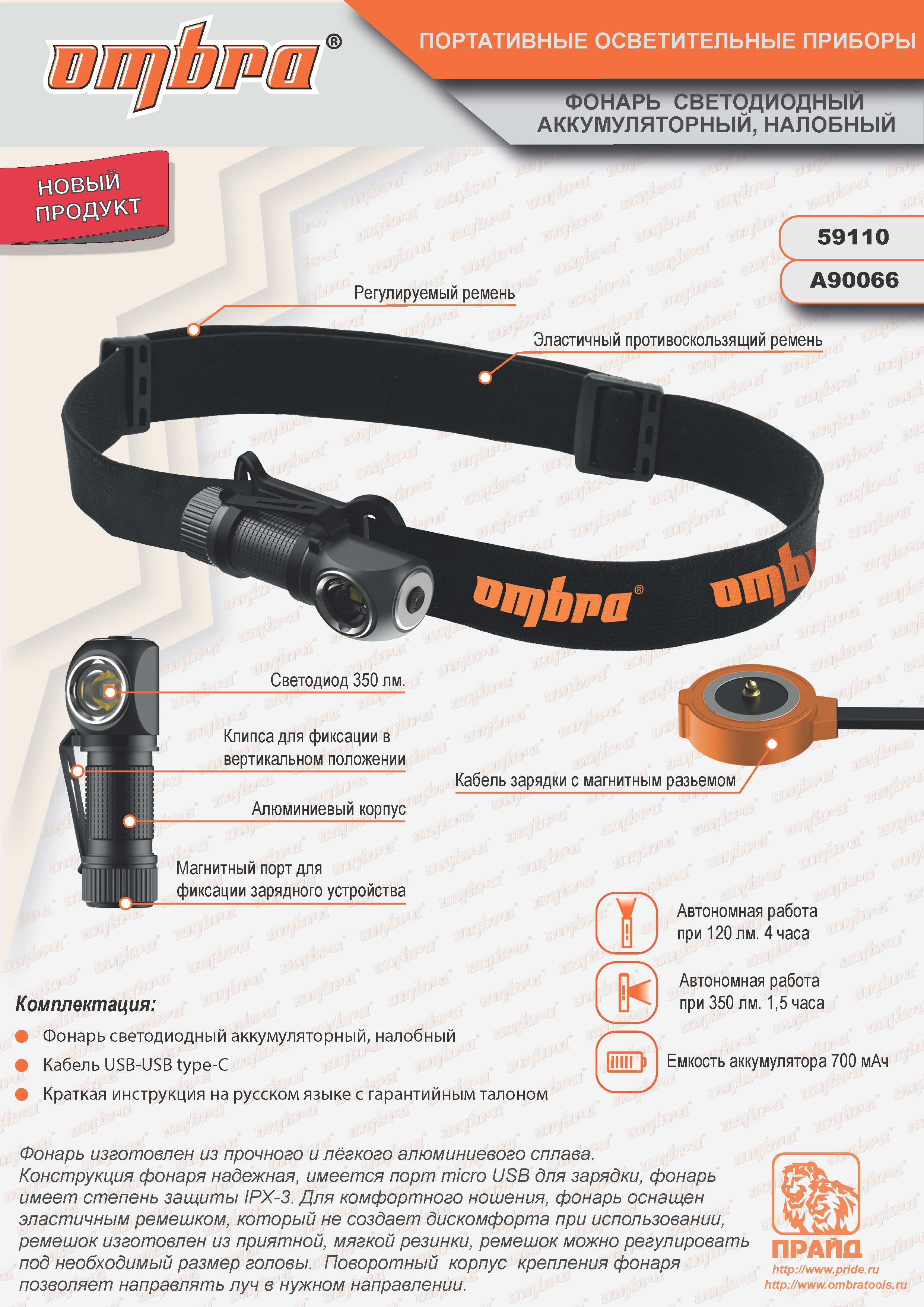 Ombra A90066 Фонарь светодиодный аккумуляторный, налобный, со световым пучком 350 Лм A90066