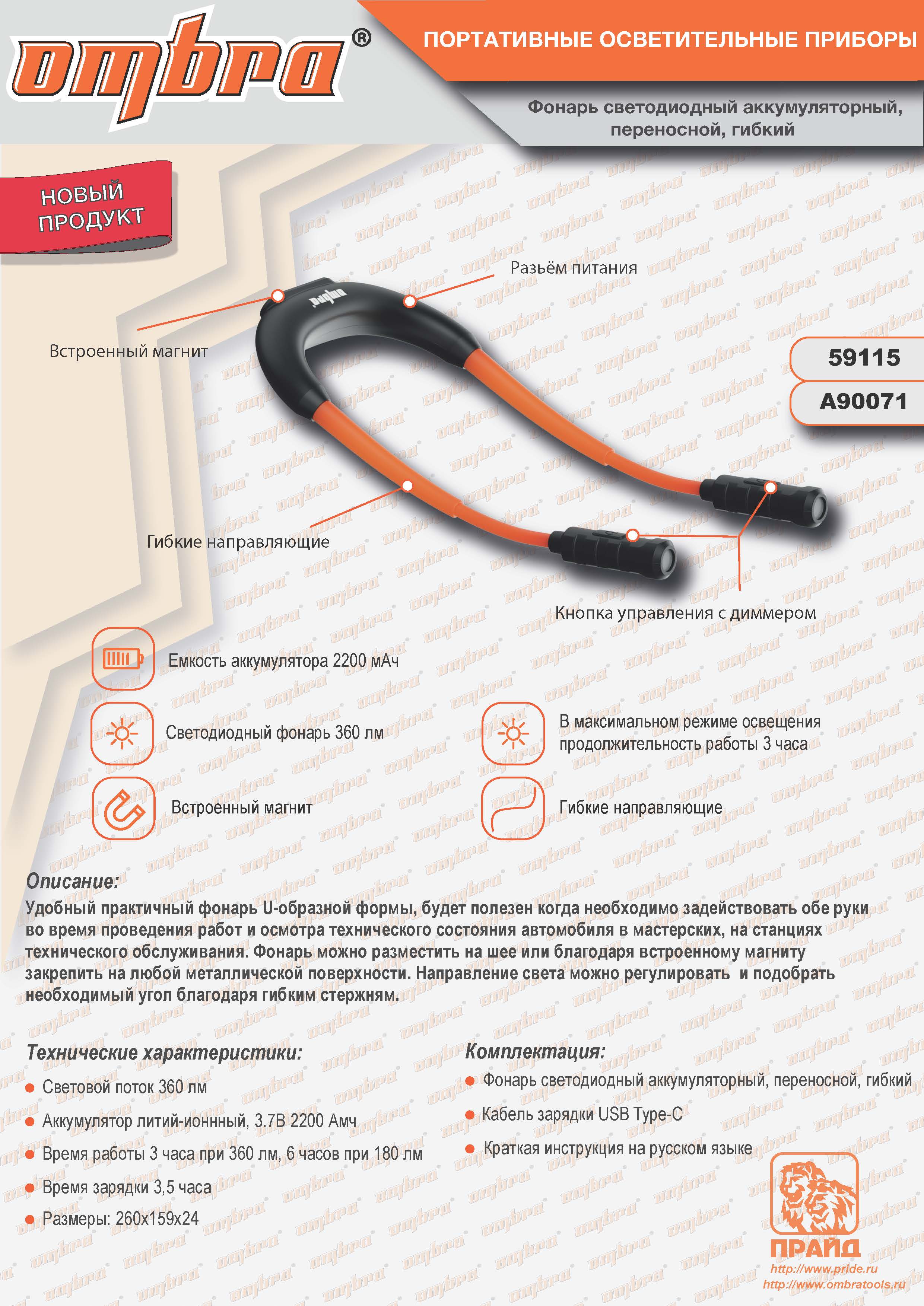 Ombra A90071 Фонарь светодиодный аккумуляторный, переносной, гибкий, со световым пучком 2 х 360 Лм A90071